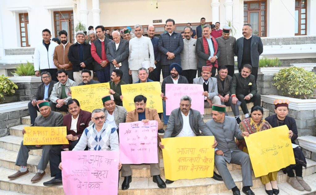हिमाचल प्रदेश विधानसभा विंटर सेशन के पहले सदन के भीतर व बाहर तपिश देखने को मिली। विपक्ष पंचायत चुनाव में देरी पर चर्चा के लिए सदन में काम रोको प्रस्ताव लाया, जबकि कांग्रेस विधायकों ने बेटी बचाओं, भाजपा भगाओ नारे के साथ विधानसभा गेट पर प्रदर्शन किया। इस दौरान- कांग्रेस विधायकों ने यौन उत्पीड़न के आरोपों से घिर MLA से इस्तीफे की मांग की।