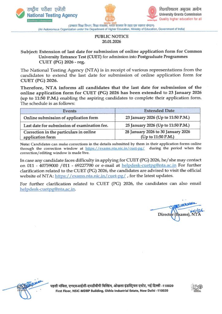 ADMISSION GUIDE extension of last date for submission of online application form for CommonUniversity Entrance Test (CUET) for admission into Postgraduate ProgrammesCUET (PG) 2026 admin 2 hours ago 1 min read CUET (PG) 2026 Spread the love Tags: CUET (PG) 2026 nta news nta update cuet exam Continue Reading Previous: What Percentile You Need in JEE Main to Qualify for JEE AdvancedNext: Advisory and Instructions for the Candidates of Joint Entrance Examination (Main) -2026 Session 1 (January 2026) Leave a Reply Cancel replyYour email address will not be published. Required fields are marked *Comment * Name * Email * Website Save my name, email, and website in this browser for the next time I comment. Related Stories JEE Advanced 2026 schedule released 1 min read ADMISSION GUIDE JEE Advanced 2026 schedule released admin 1 hour ago JEE MAIN 2026 ADMIT CARD 1 min read ADMISSION GUIDE JEE MAIN 2026 ADMIT CARD admin 2 hours ago JEE MAIN 2026 NOT ALLOWED 1 min read ADMISSION GUIDE JEE MAIN 2026 NOT ALLOWED admin 2 hours ago JEE MAIN 2026 Important documents / items to carry on the day of examination 3 min read ADMISSION GUIDE JEE MAIN 2026 Important documents / items to carry on the day of examination admin 2 hours ago JEE MAIN 2026 please check the following as indicated on the Admit Card: 1 min read ADMISSION GUIDE JEE MAIN 2026 please check the following as indicated on the Admit Card: admin 2 hours ago Advisory and Instructions for the Candidates of Joint Entrance Examination (Main) -2026 Session 1 (January 2026) 1 min read ADMISSION GUIDE Advisory and Instructions for the Candidates of Joint Entrance Examination (Main) -2026 Session 1 (January 2026) admin 2 hours ago